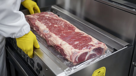 A fresh raw beef cut is carefully packed in plastic, emphasizing food safety and hygiene in a meat processing facility, showcasing quality preparation techniques.