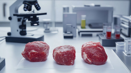 Lab-grown meat samples beside microscopes and analytical devices on a bright workbench