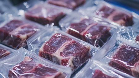An array of freshly packaged red meat cuts displayed in vacuum-sealed plastic bags, ideal for grocery stores or butcher shops. Perfect for culinary uses.