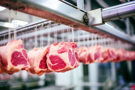 Fresh red meat cuts are displayed on a conveyor belt in a modern meat processing facility, emphasizing quality, hygiene, and efficient production methods.