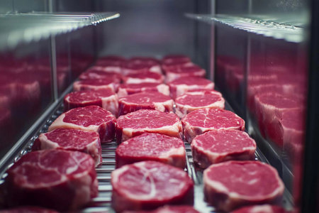 Freshly cut ribeye steaks arranged neatly on shelves in a modern meat refrigerator during the early morning hours. Generative AI