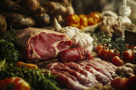 Vibrant assortment of fresh vegetables, cuts of meat, and grains provides a colorful backdrop for meal preparation in a rustic kitchen setting.