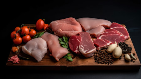 A variety of meats are arranged on a black surface. AI generative image