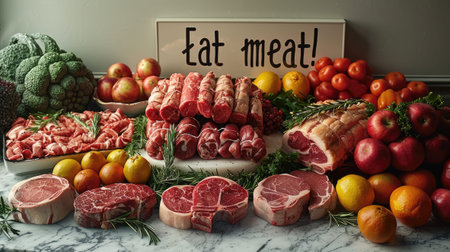 various fresh meats accompanied by a bold sign proclaiming Eat more meat atop a sleek, white modern table for a tantalizing culinary display