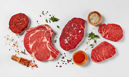 Various raw beef steaks with herbs and spices. Top view flat lay