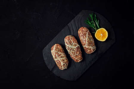 Traditional Cypriot Seftalia dish raw top view, on a black background, no people,