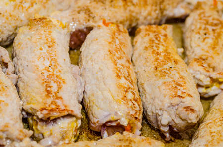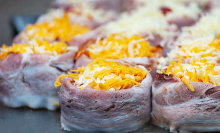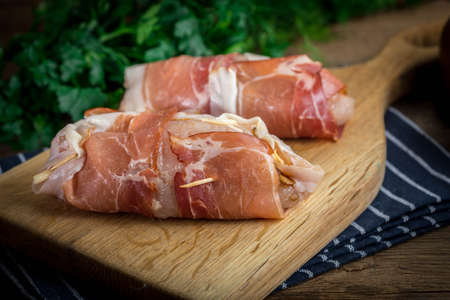 Raw chicken breast stuffed with champignon wrapped with bacon - ready to baked.