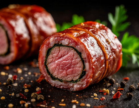Meat roll with spicy sun dried tomatoes inside put diagonally