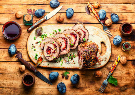Appetizing roll roast with autumn plum and nuts.Pork porchetta.Copy space