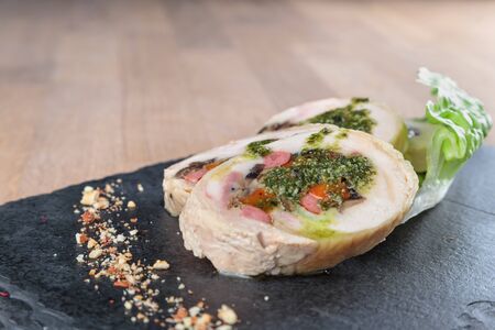 chicken rolls stuffed with vegetables and smoked sausages with lettuce leaves, pesto sauce, decorated with walnut crumbs