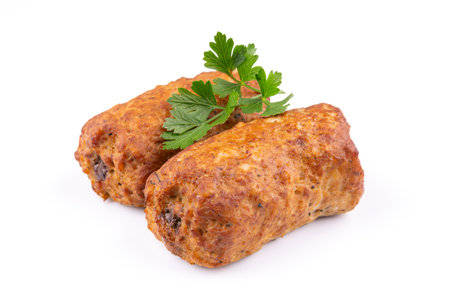 rolls of meat with bacon, chevapchichi or Kofta kebab, Food recipe background. close up,