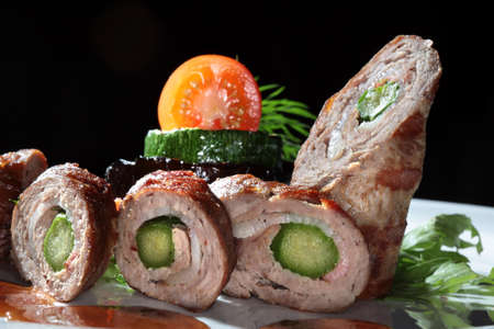 Beef roll stuffed with cherries close-up on a plate and sauce. horizontal view from above