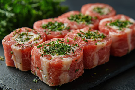 Beef meat rolls stuffed with mushrooms and herbs. Top view. Copy space
