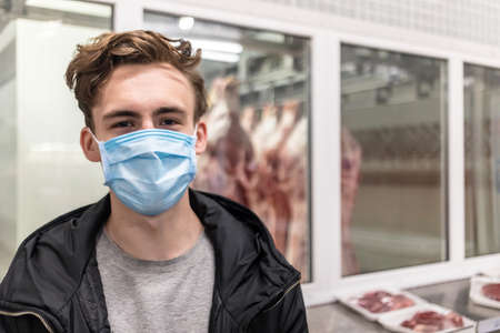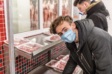Young man wearing disposable medical mask shopping in supermarket during coronavirus pneumonia outbreak. Protection and prevent measures while epidemic time. Covid-19 person