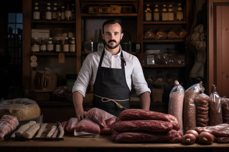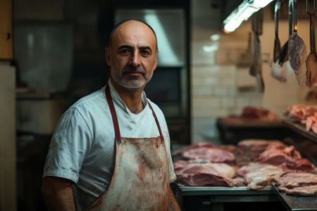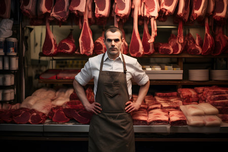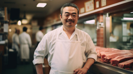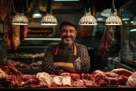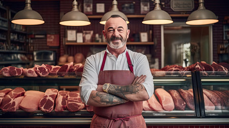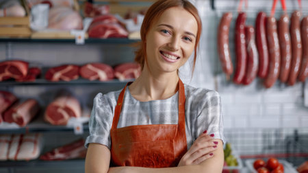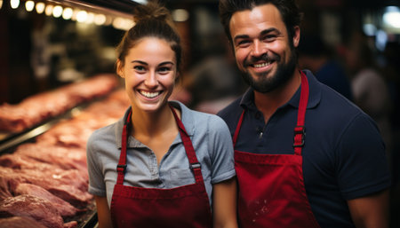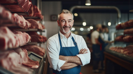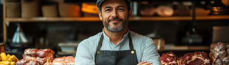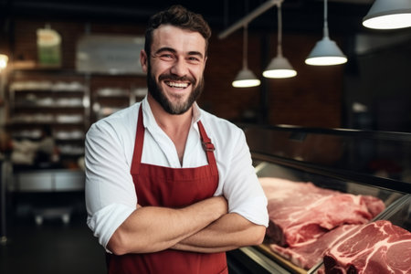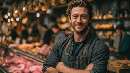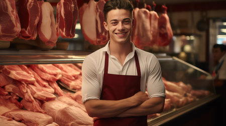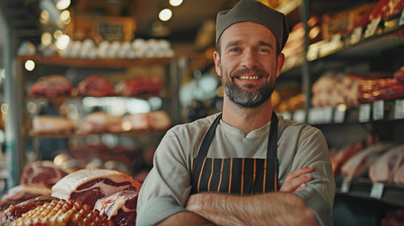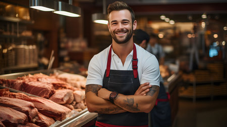 Cheerful butcher smiling warmly behind the meat counter at a bustling grocery store market