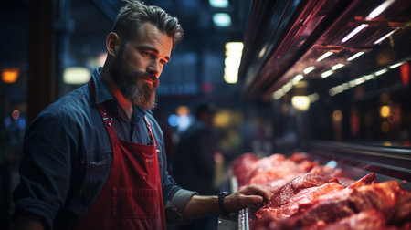 Bearded butcher dressed in a fleece shirt serving fresh cut meat in a market.