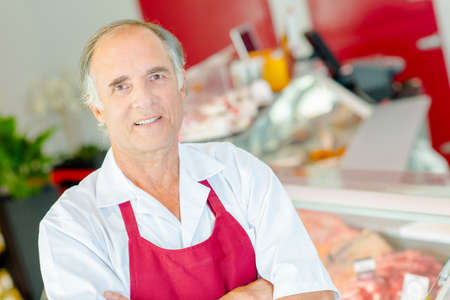 Confident butcher. Smiling young butcher keeping arms crossed and looking at camera while standing at supermarket checkout with meat in the background