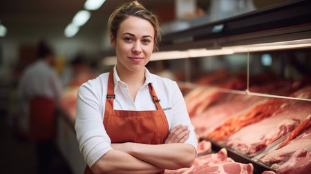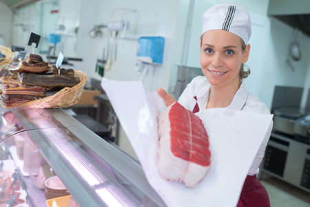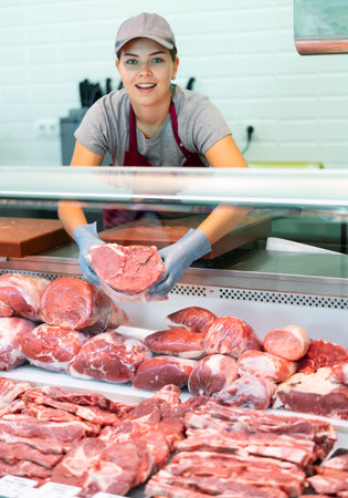 Positive young saleswoman vendor in apron and disposable gloves shows meat tenderloin