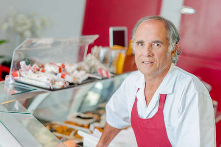 Cheerful butcher behind the counter of a grocery store meat market, offering fresh cuts and service
