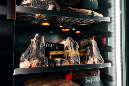 Premium Rare Sirloin Dry-Aged Wagyu A5 beef with high-marbled texture inside refrigerator.
