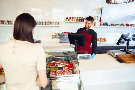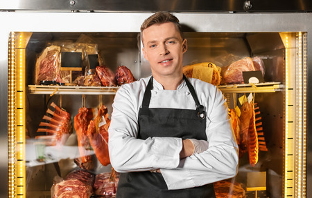 Young butcher holding raw meat steaks in fridge of grocery shop