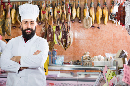 Cheerful man seller showing sorts of meat in butcher’s shop