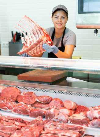 Butcher shop salesgirl holding slab of raw beef ribs for tomahawk steak