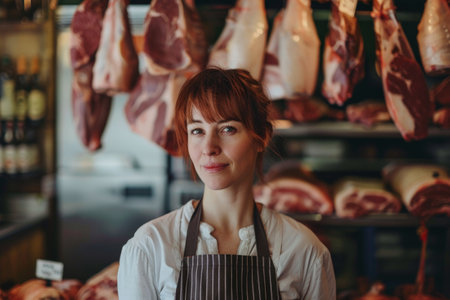 SOMBOR, SERBIA - MARCH 19, 2016: Woman, a butcher, standing in front of a butcher shop, Mesara, in Sombor, in the local market, selling meat and other animal products.