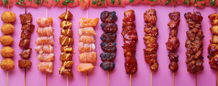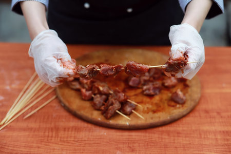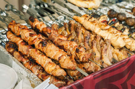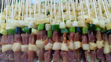 Grilled skewers of meat on wooden stick is fried street food festival.