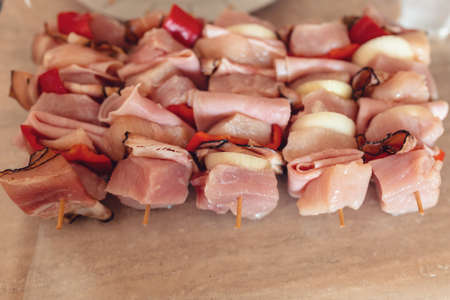 raw meat, chicken, bacon, pork, onion and hot spices on skewers ready for grill.