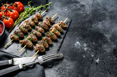 Grilled shish kebab with chicken hearts. Black background. Top view. Copy space.