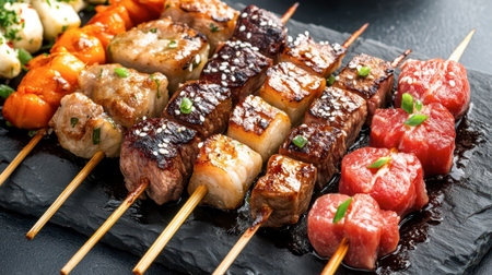 Delicious grilled pork meat and vegetable kebabs on black plate