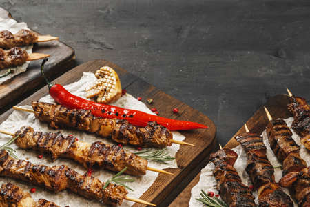 Grilled skewers of meat and vegetables on a wooden board, colorful and tasty dish, tasty meal