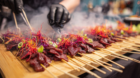 Grilling barbecue meat skewer kebab at traditional night market stall, delicious street food in South Korea.