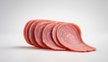 Freshly sliced red meat displayed in a neat arrangement on a white plate
