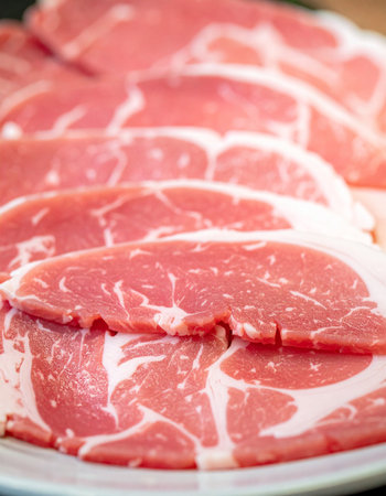 Thin sliced pork meat prepared for shabu or sukiyaki or Japanese hot pot. Selective focus.