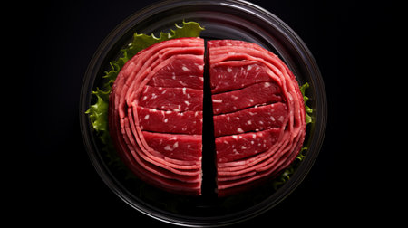 raw beef steaks, captured with a fish-eye lens, are showcased on a black background in a clear glass. the composition resembles layered fibers, creating a visually striking image. this artistic photograph, taken with a tokina at-x 11-16mm f/2.8 pro dx ii lens, features circular shapes and is reminiscent of the angura kei style. it evokes a sense of grocery art, with the use of fujifilm
