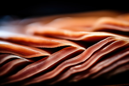 Explore a close-up view of layers of freshly cut meats and bacon arranged elegantly on a dark tray, showcasing rich textures and savory appeal.