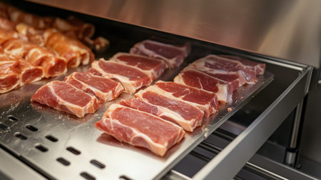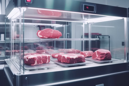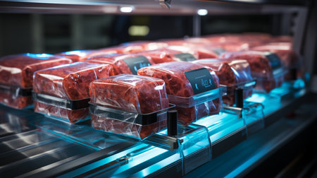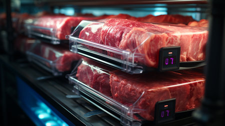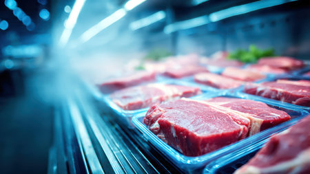 Fresh raw meat in refrigerator close up. Meat production concept. 3d rendering.ai generated