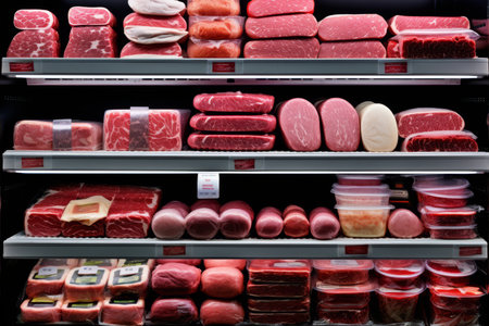 Shelves with different kinds of meat in refrigerator, closeup.ai generated