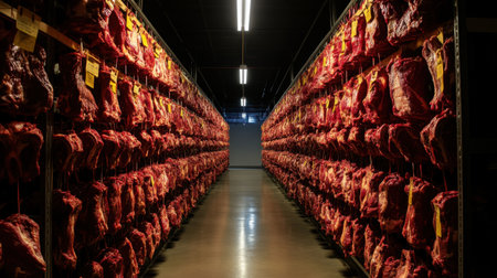 This image captures an extensive cold storage facility filled with meticulously arranged hanging red meat cuts, emphasizing industrial processes and food preservation.