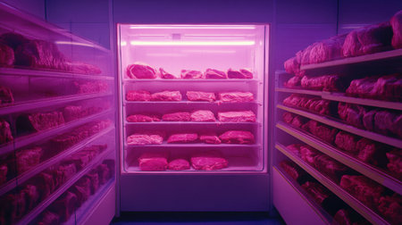 An artistic view of a modern meat refrigerator displaying fresh cuts in vibrant neon pink light, highlighting quality and freshness in a contemporary butcher shop.