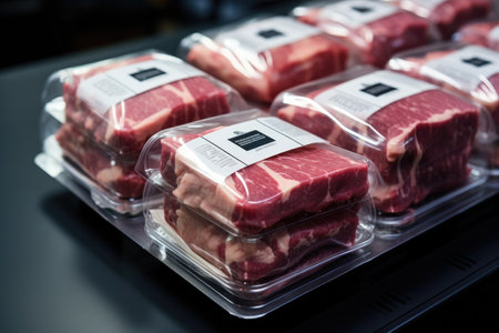 A close-up view of freshly packaged premium cuts of beef displayed in a meat processing facility highlighting food quality and preparation standards.