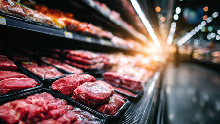 A vibrant display of fresh cuts of meat, illuminated by bright LED lights in a modern butcher shop. Perfect for culinary and food industry concepts.