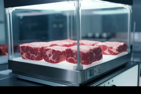 Raw pieces of artificially lab-grown meat lying in transparent containers with illumination growth of vegan beef for scientific purposes modern laboratory .generative AI