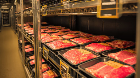 An industrial meat storage facility showcasing neatly arranged trays of fresh cuts inside a refrigerated environment. Ideal for food industry visuals.