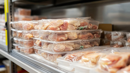 This image showcases an industrial meat storage facility with neatly packaged meat products in transparent trays on metal shelves, emphasizing organization and freshness.