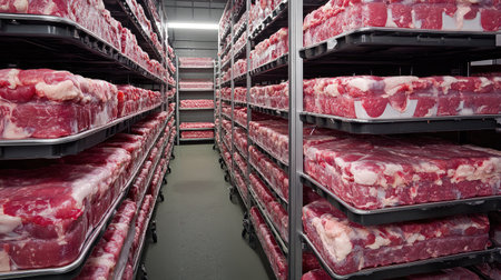 A well-organized meat storage facility featuring refrigerated shelves lined with packaged raw meat. The environment emphasizes cleanliness, hygiene, and efficient inventory management.
