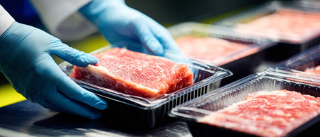 Hands in rubber gloves hold marbled steaks, packing them in transparent containers in a busy food processing facility for future use and sale.