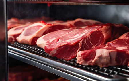 A visually captivating image of an industrial fridge showcasing an array of fresh meat cuts. The vibrant red tones highlight the quality of the products in a well-organized storage environment.